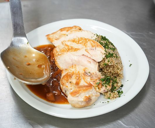 - Commencer par mettre le risotto de quinoa puis la volaille puis arroser de sauce. -